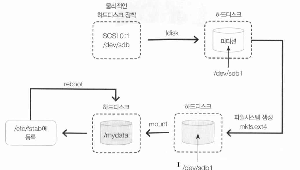 (1) 마운트 작업 : 하드 디스크, CD-ROM 사용 시 리눅스에서는 해당 장치들을 파일 시스템의 특정 디렉토리에 연결해서 사용할 수 있도록 준비하는 작업을 의미한다.