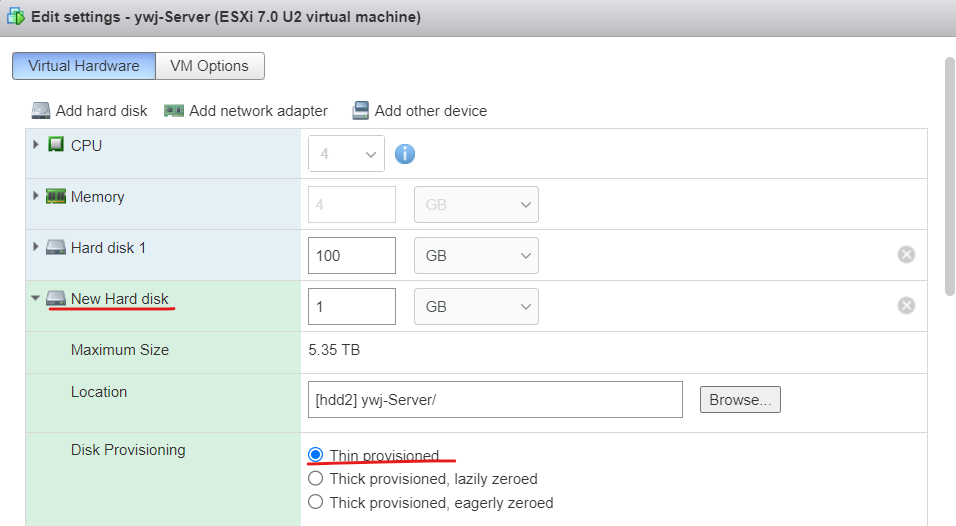 (1) 물리적인 하드 디스크 2, 3GB를 각각 추가한다. (Thin Provisioned)