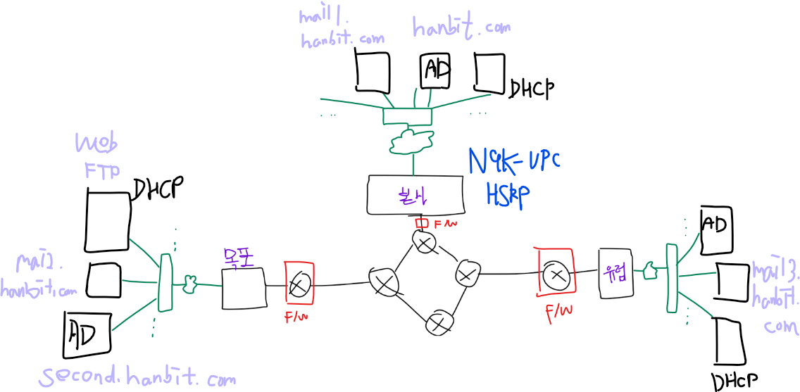 - 본사 내부 네트워크는 N9K-VPC 구성, Trunk, EtherChannel, HSRP로 구성한다.