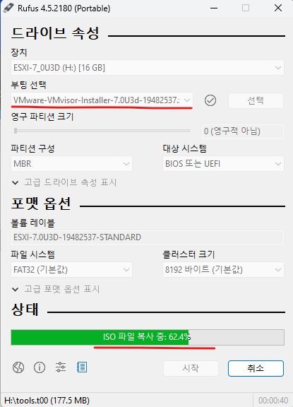 (1) Rufus와 같은 툴을 사용해서 VMWare-VMvisor-Installer-7.0U3d-19482537.x86_64.iso 파일을 기준으로 부팅 USB 생성