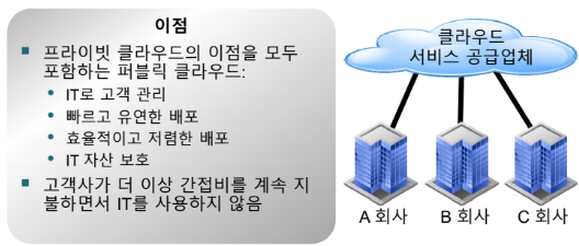 - 퍼블릭 클라우드와 프라이빗 클라우드를 결합하여 각각의 장점을 살리는 클라우드 환경이다.