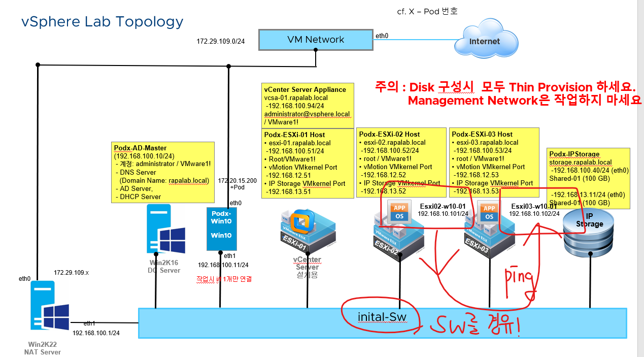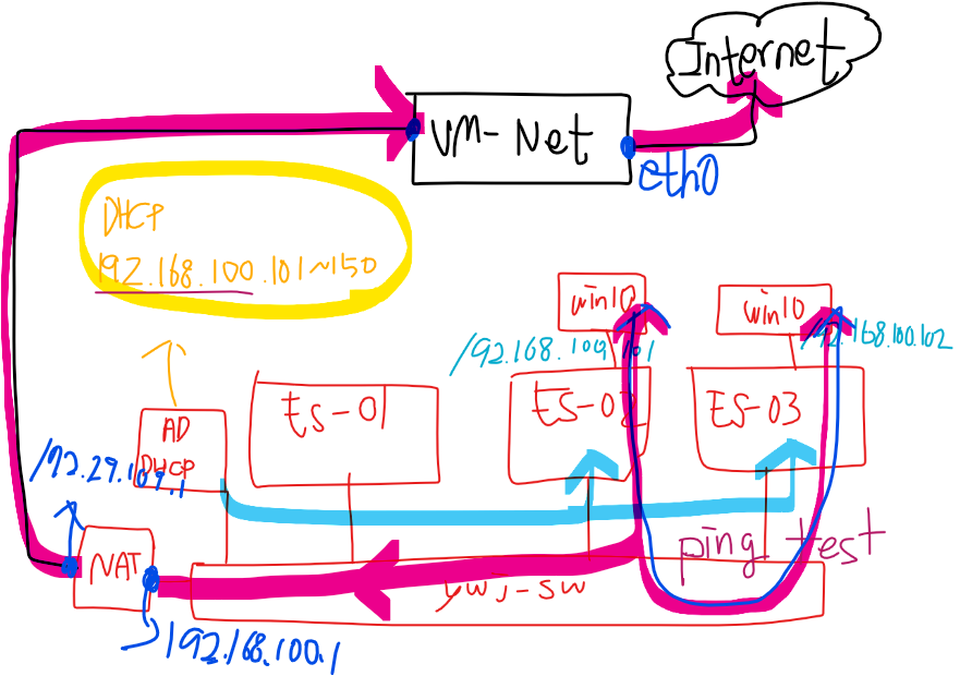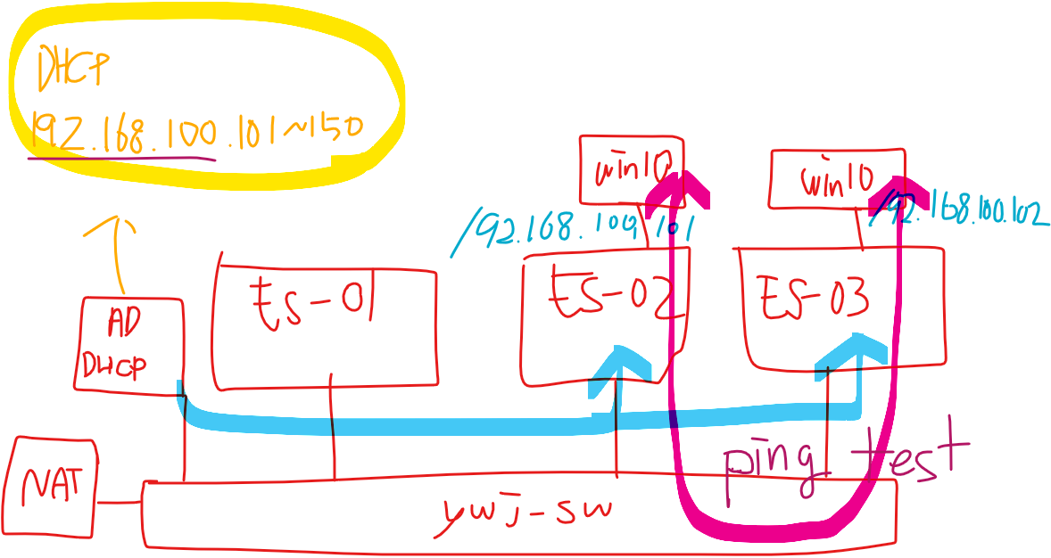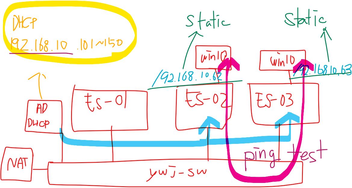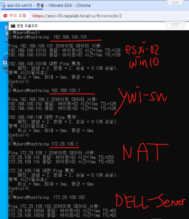 (13) ESXi-02 Win10, ywj-sw(Virtual Swtich), NAT, DELL-Server로 모두 ping이 수행된다.