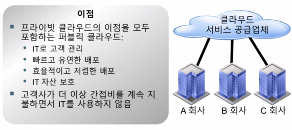 - 클라우드 서비스 제공업체(CSP, Cloud Service Provider)가 소유하고 운영하며, 여러 사용자가 공용으로 이용하는 클라우드 환경을 의미한다.