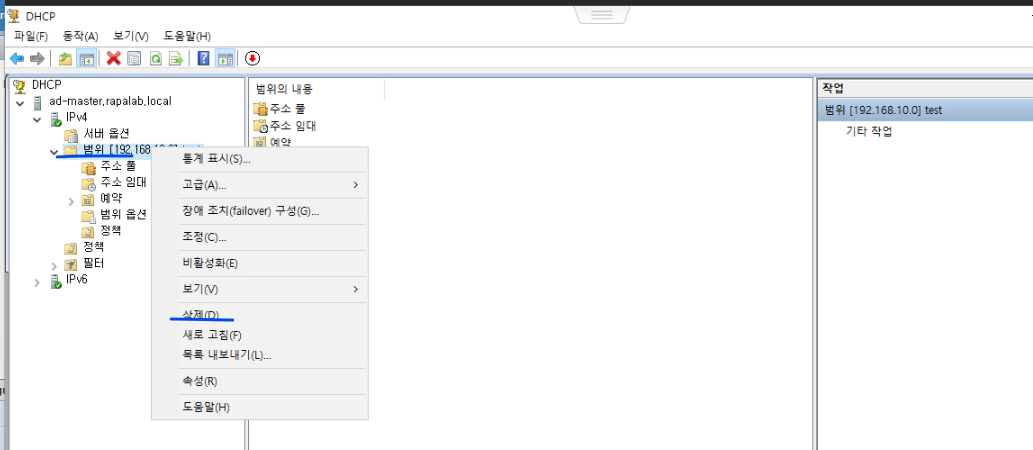 (7) ADMaster에서 DHCP 주소 풀을 변경하기 위해 기존 풀을 삭제한다.