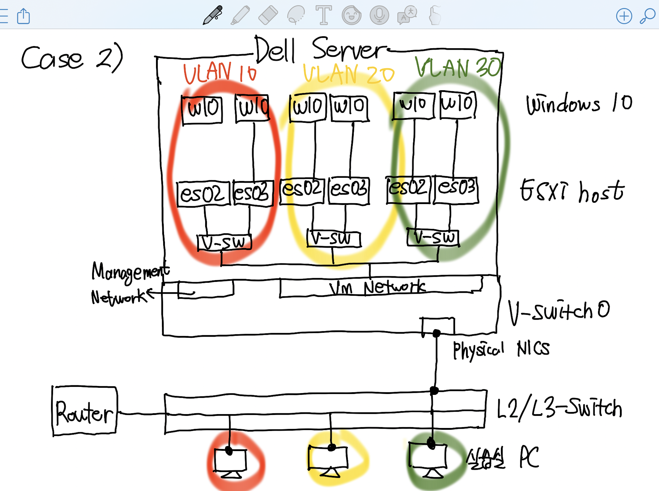 4-2. Topology - VLAN, TRUNK, ROUTING을 추가하여 실습실 PC, ESXi 호스트 내부 VM(Win10) 간 통신하는 경우
