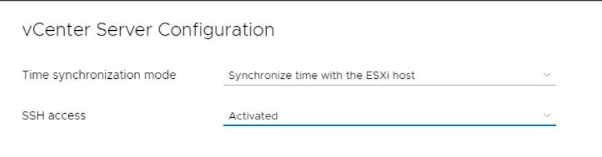 (28) Time Synchronization mode : Synchronize time with the ESXi host / SSH access 접속 여부를 Activation으로 설정하고 넘어간다.