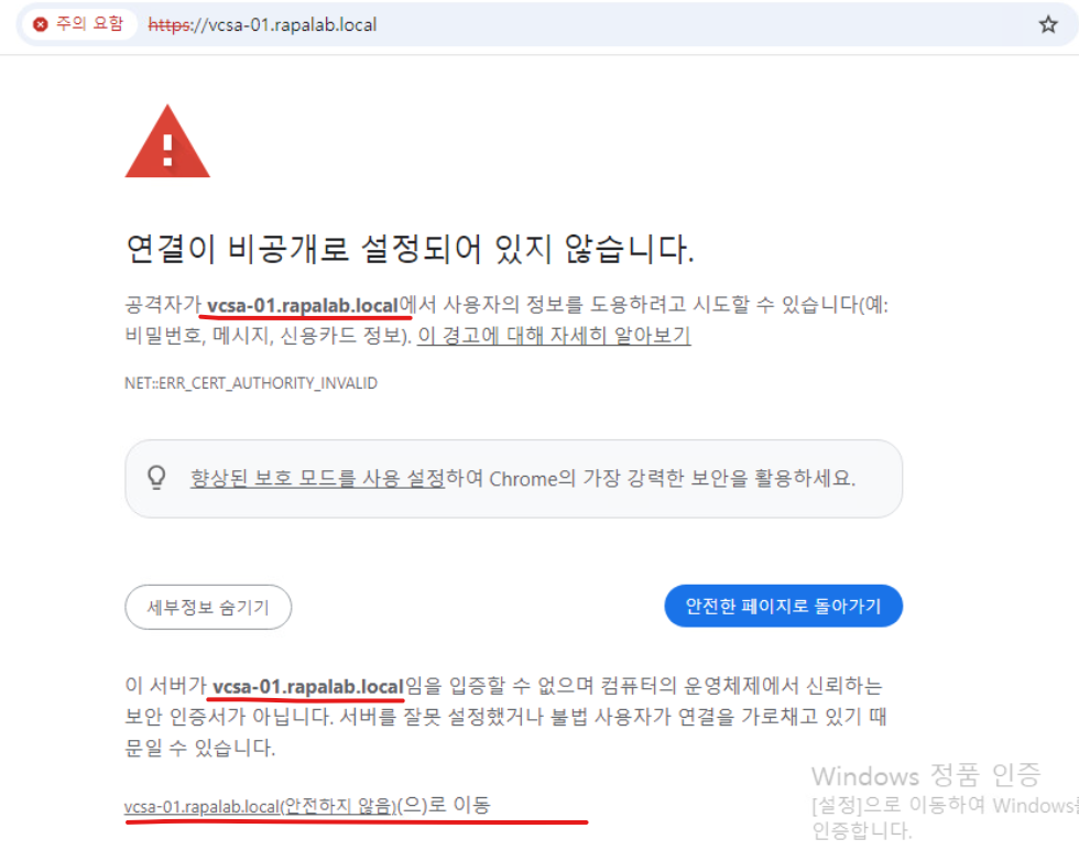 (17) 정상적으로 해당 도메인 탐색이 가능하다면 Certificate Warning이 나타나고 YES를 눌렀을 때 탐색 과정을 마쳐서 다음 작업이 진행되어야 한다. (만약 해당 과정에서 오류가 있다면 다음 항목으로 넘어가지 않는다.)