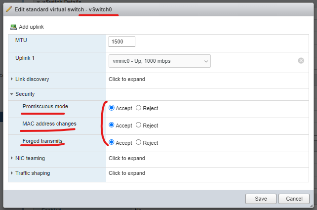 (5) 작업 이전, vSwitch0의 보안 구성을 모두 Accept로 변경한다.