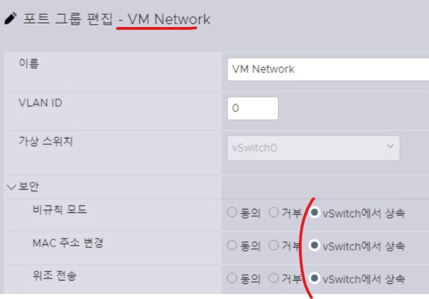 (3) 가상 스위치의 보안 항목이 모두 동의 옵션으로 체크되어 있는지 확인한다.