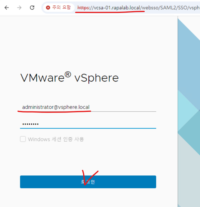 (35) SSO 단일 자격 증명으로 administrator@vsphere.local / 패스워드를 입력해서 호스트에 로그인한다.