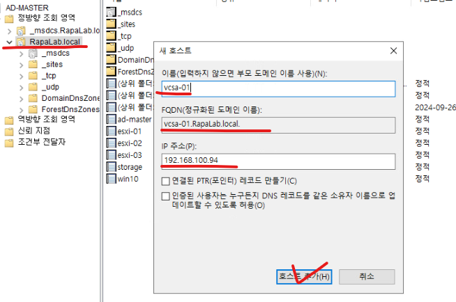 (9) ADMaster DNS 도메인에 esxi-01 호스트에 대한 도메인 정보를 등록해 둔다.