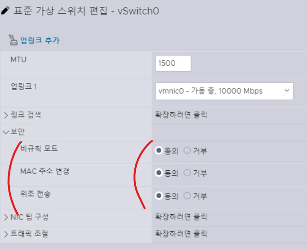 (3) 가상 스위치의 보안 항목이 모두 동의 옵션으로 체크되어 있는지 확인한다.
