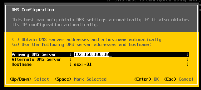 (2) esxi-01 주소 대역 / DNS 서버 설정 / DNS Suffixes 정보 체크