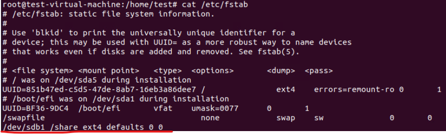 (17) 현재 포스팅에선 생략되었지만, nano /etc/fstab으로 마운트된 내역을 추가해줘야 한다. 현재는 cat 명령으로 추가한 내용을 출력해 주었다. (재부팅 이후에도 마운트 내역을 유지하기 위한 목적)