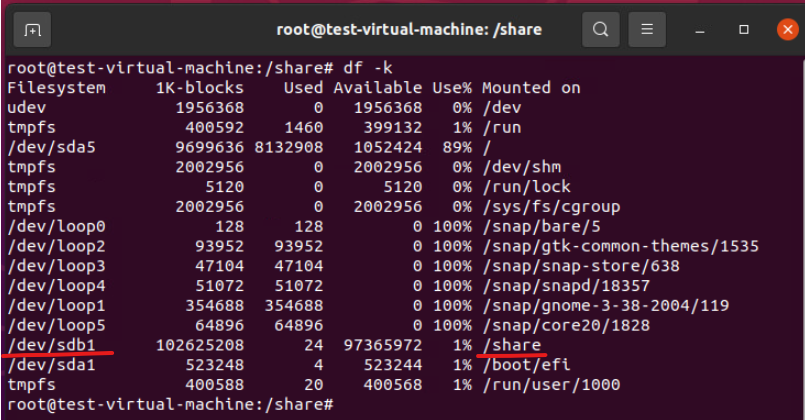 (16) 이후 생성된 /share를 기준으로 /dev/sdb1 파티션을 마운트한다 (mount /dev/sdb1 /share)