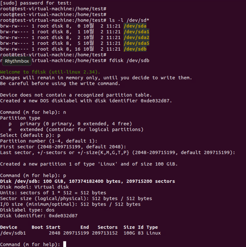 (13) 위와 같은 fdisk 명령을 기준으로 /dev/sdb 디스크를 파티션으로 생성한다.