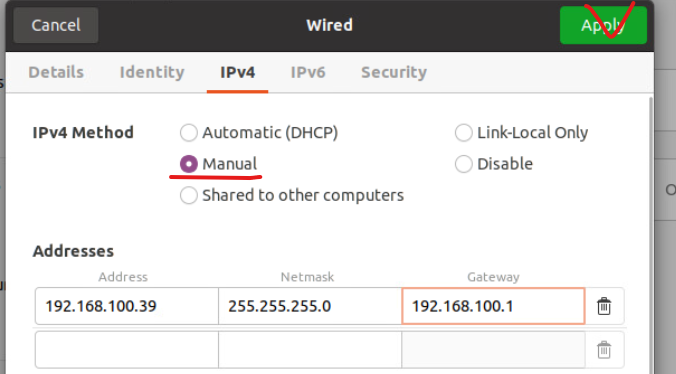 - 192.168.100.39 / 255.255.255.0 / 192.168.100.1 (Default Gateway)