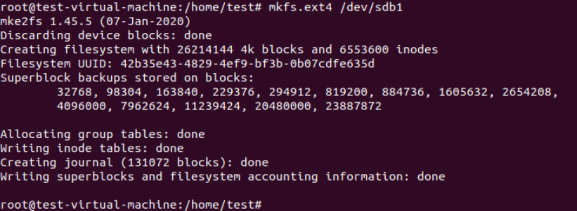 (15) 생성된 파티션을 mkfs.ext4 /dev/sdb1 명령으로 포맷한다.