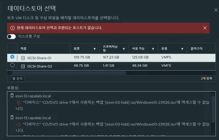 - 보조 vm 디스크 및 구성 파일을 배치할 데이터스토어( iscsi-share-01 )를 지정한다.