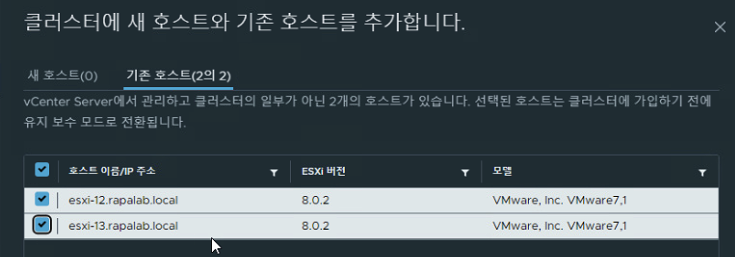 (3) FT-TEST 클러스터에서 빠른 시작 메뉴에서 호스트 ESXI-12, 13을 추가한다.
