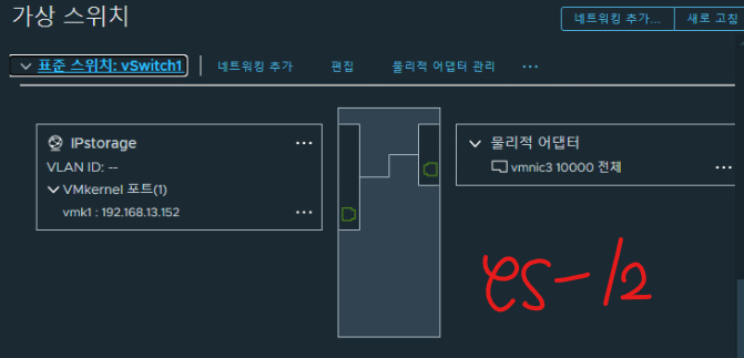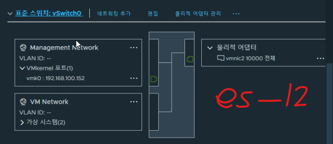(2) ESXi-12 호스트 기준 가상 스위치 재구성이 완료되었다. (기존 실습 토폴로지 참고)