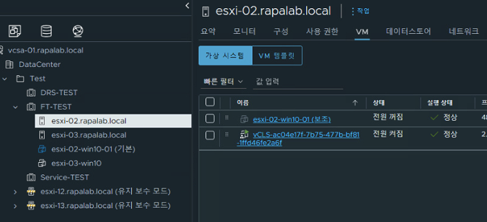 - 위와 동일하게 FT-test 디렉터리에 esxi-02, 03 호스트를 추가 & 클러스터 재구성 & 스위치 VMKernel Fault Tolerance Logging 활성화를 진행한다.