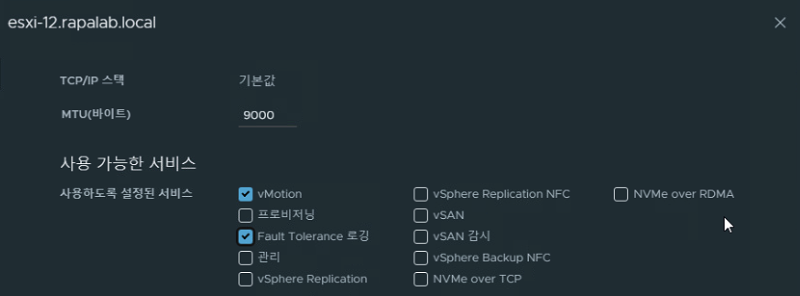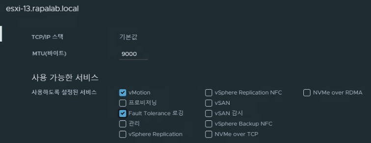(6) 작업 이전 유지 보수 모드를 해제하고 vMotion vmkernel이 가상 스위치 환경으로 구성되어 있는지 esxi-12, 13 호스트에 대해 확인이 필요하다. 확인했다면 스위치 vMotion VMKernel 설정 편집에서 Fault tolerance Logging 옵션을 활성화시킨다.