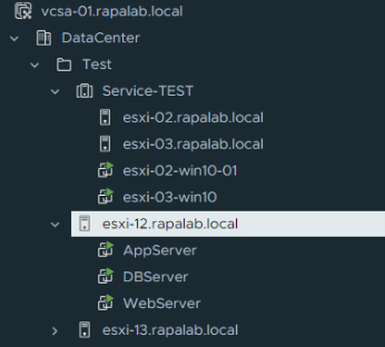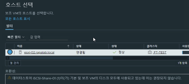 (8) 현재 위와 같은 메시지가 확인되어 esxi-12, 13 호스트가 아닌 esxi-02, 03 호스트를 FT-TEST 디렉터리로 옮긴 뒤 실습해 볼 계획이다.