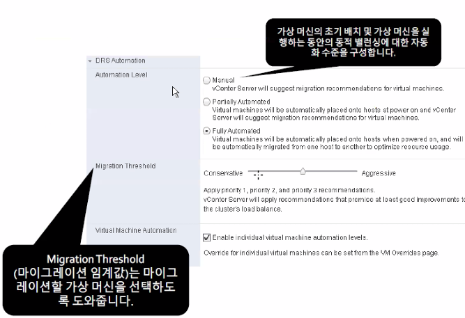 - 가상 머신의 초기 배치 및 가상 머신을 실행하는 동안의 동적 밸런싱에 대한 자동화 수준 구성을 구성하는 옵션이다.