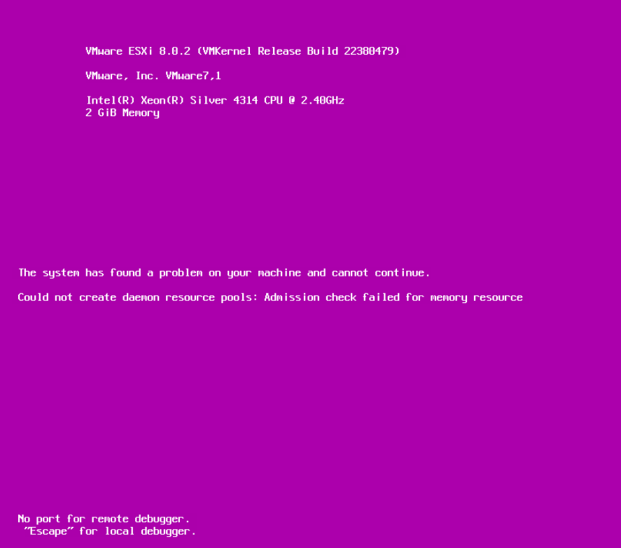 (4) 만약 호스트 부팅 중 해당 메시지가 나타난다면 시스템 사양이 전체적으로 부족해서 ESXi Hypervisor를 부팅할 수 없는 상황이다. 메시지가 떴다면 사양을 조금 더 올려서 진행한다.
