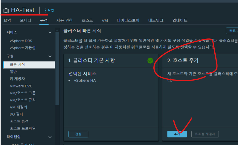 (1) 호스트 영역에서 데이터 센터 생성 > 하단에 Test 디렉터리 생성 > 디렉터리 내부에 ESXi-02, 03 호스트를 등록한다.