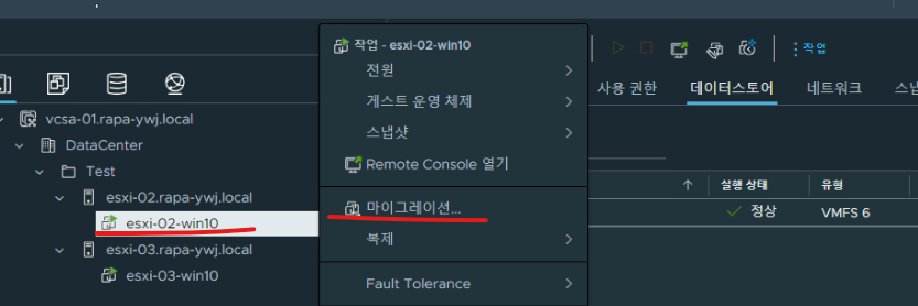 (5) ESXi-02번 호스트의 VM에 대해서 스토리지 마이그레이션이 완료되었으며, ESXi-03 호스트의 VM에 대해서도 진행한다.