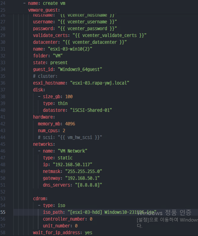 (3) 또한 부팅 디스크 인식을 위한 cdrom, type, iso_path(로컬 스토리지 내부 Windows 10), controller_number, unit_number를 사용했다.