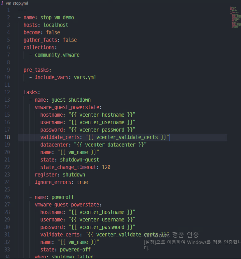 (2) 위와 같이 VM의 전원 종료를 위한 스크립트인 vm_stop.yml을 작성한다.