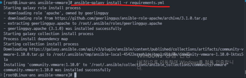 (2) 해당 명령어는 Ansible Galaxy에서 역할(role)을 설치하기 위해 사용된다. -r 옵션으로 요구사항을 명시할 수 있으며 설치할 역할의 이름 버전 등의 정보를 포함한다.