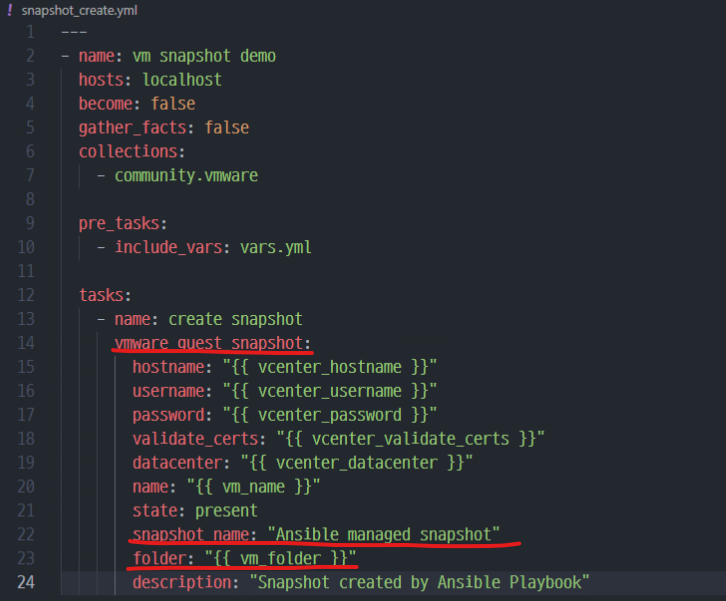 (1) 위와 같이 가상 머신의 스냅샷 생성을 위한 snapshot_create.yml 스크립트 파일을 생성한다.