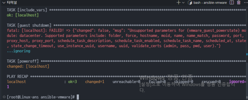 (3) 또한 vmware_guest_powerstate 키값의 경우 내부에 datacenter를 사용하는 것을 더 이상 지원하지 않는다고 한다. 따라서 guest shutdown 작업은 오류가 나며 수행되지 않는다. ignore_errors 키로 인해서 오류가 나더라도 작업이 멈추지 않고 다음 스크립트로 넘어가게 된다.