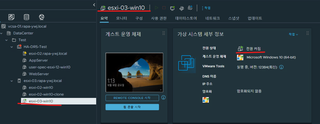 (1) 스크립트 실행 이전 esxi-03 호스트의 VM은 전원이 켜져 있다.