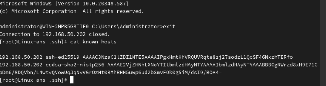 (4) 위와 같이 Windows 서버에 접속을 시도해본다. 접속 성공 시 known_hosts 파일에 접속 정보가 남게 된다.