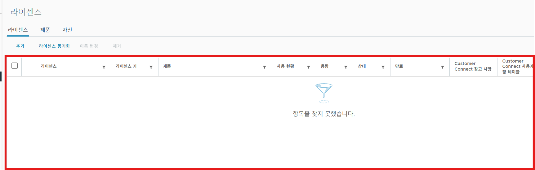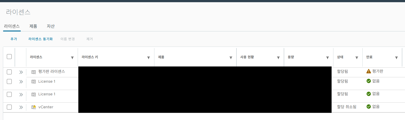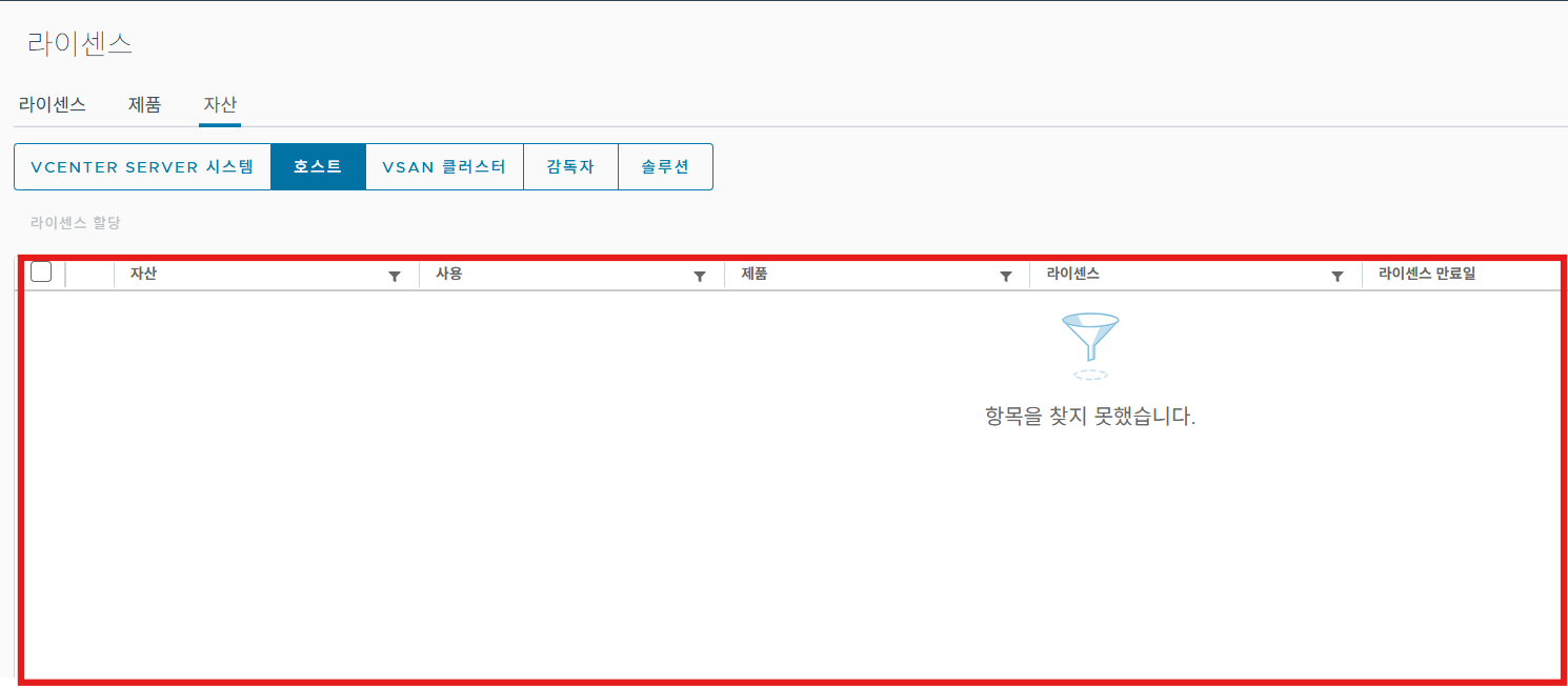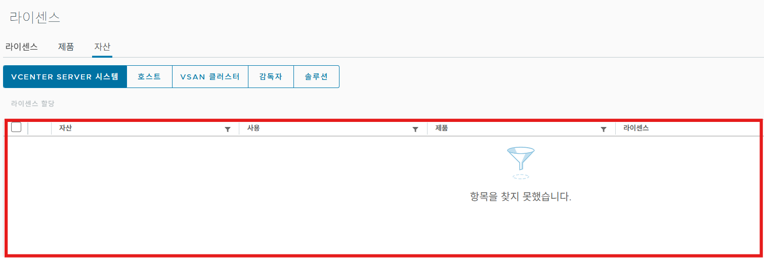 (2) GUI에서 라이센스를 할당하는 작업부터 시작해서 ESXi 호스트, vCenter에 등록된 라이센스를 찾을 수 없다.