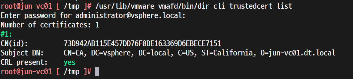 (1) vmdir에서도 인증서 게시를 취소하여 VECS에서도 TRUSTED_ROOT 인증서가 1개만 남은 것을 확인할 수 있다.