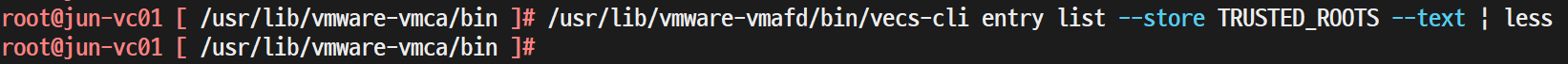 > /usr/lib/vmware-vmafd/bin/vecs-cli entry list --store TRUSTED_ROOTS --text | less