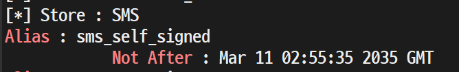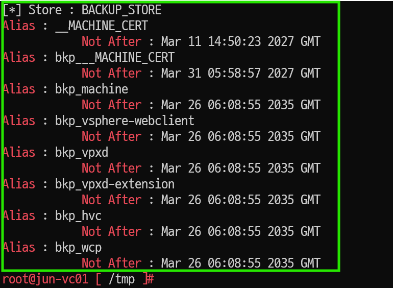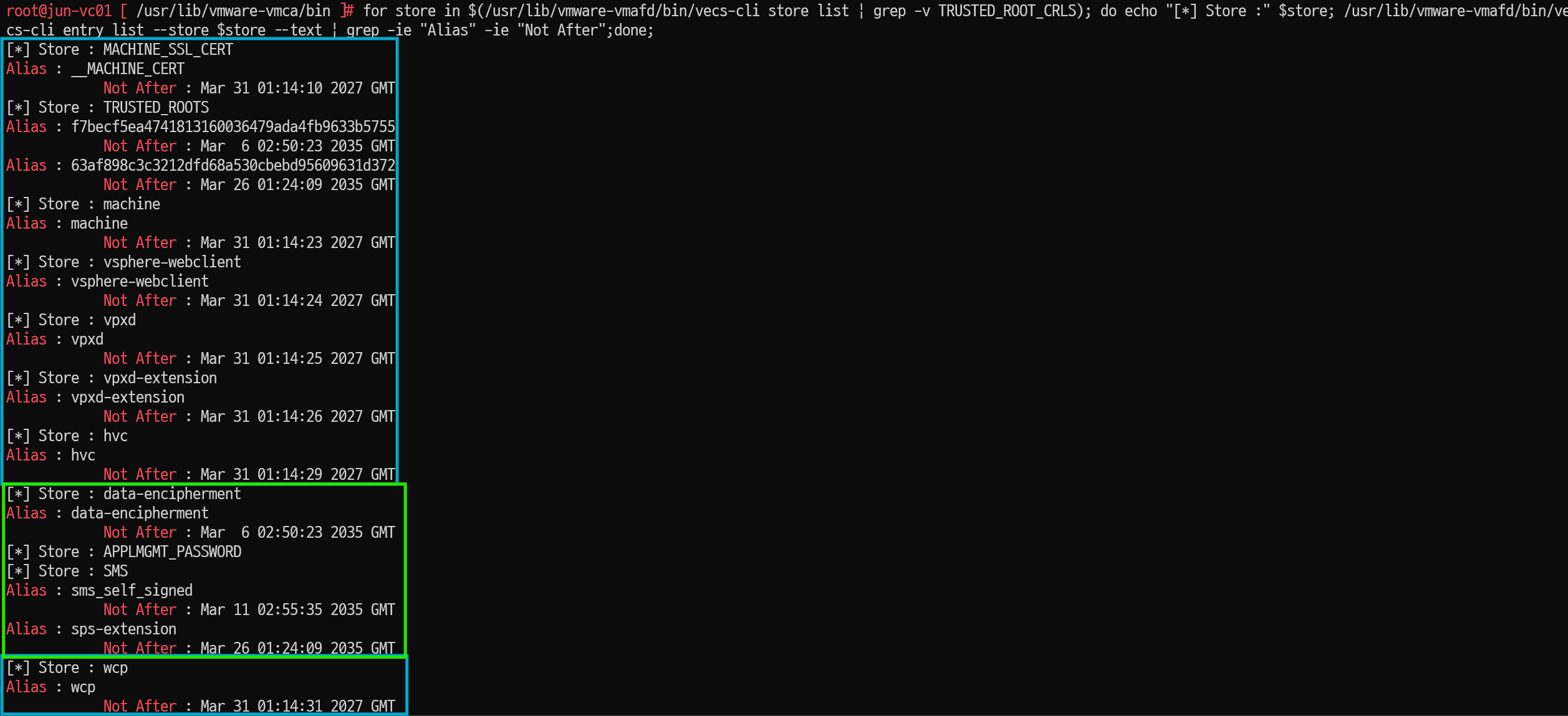 > for store in $(/usr/lib/vmware-vmafd/bin/vecs-cli store list | grep -v TRUSTED_ROOT_CRLS); do echo "[*] Store :" $store; /usr/lib/vmware-vmafd/bin/vecs-cli entry list --store $store --text | grep -ie "Alias" -ie "Not After";done;