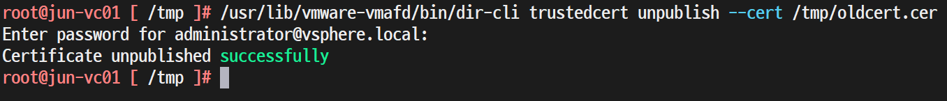 > /usr/lib/vmware-vmafd/bin/dir-cli trustedcert unpublish --cert /tmp/oldcert.cer