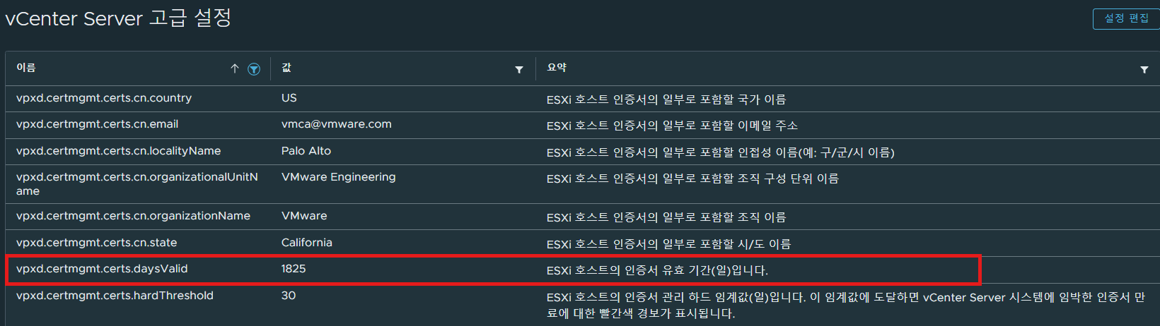 (1) vCenter 구성 > Advanced Settings > vpxd.certmgmt.certs.daysValid