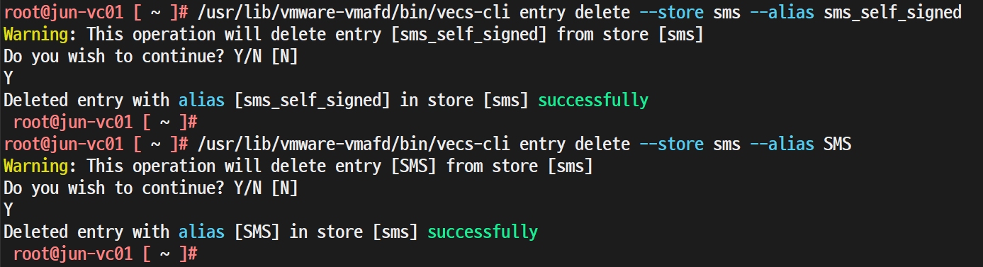 > /usr/lib/vmware-vmafd/bin/vecs-cli entry delete --store sms --alias sms_self_signed