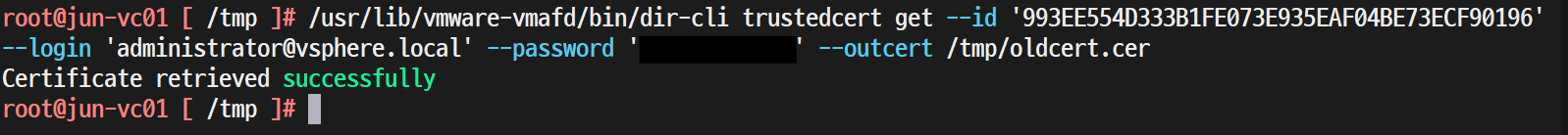 > /usr/lib/vmware-vmafd/bin/dir-cli trustedcert get --id 'CN(id)' --login 'administrator@vsphere.local' --password 'password' --outcert/tmp/oldcert.cer