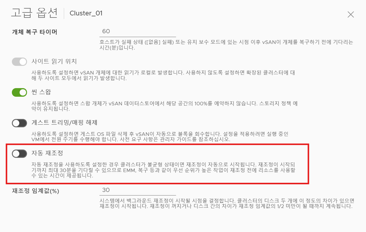 (1) vSAN에서 자동 재조정 옵션을 활성화하면, 주기적으로 각 디스크 그룹들의 사용률을 모니터링하여 각 호스트 간 사용률 불균형 발생 시 데이터들의 재배치 작업이 시작된다.