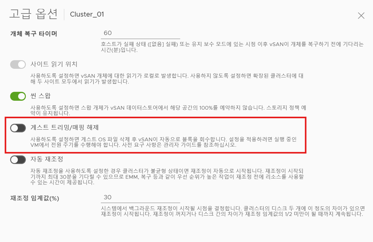 (1) vSAN에서 게스트 트리밍 또는 매핑 해제 옵션의 경우 활성화 시, VM의 Guest OS가 디스크에서 사용하지 않는 블록을 식별해서 vSAN에게 알리고 해당 블록 공간을 해제(반환, Unmap)할 수 있도록 한다.