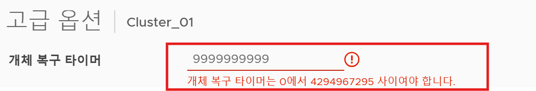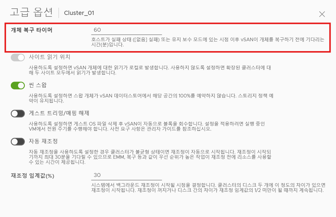 (1) 개체 복구 타이머 옵션의 경우, vSAN 클러스터 내부 호스트가 실패 상태 또는 유지 보수 모드 상태일 때 다른 호스트로 데이터들을 넘겨줘야 하는 작업(vSAN 개체 복구 작업)을 시작하기 전 대기하는 시간을 의미한다.